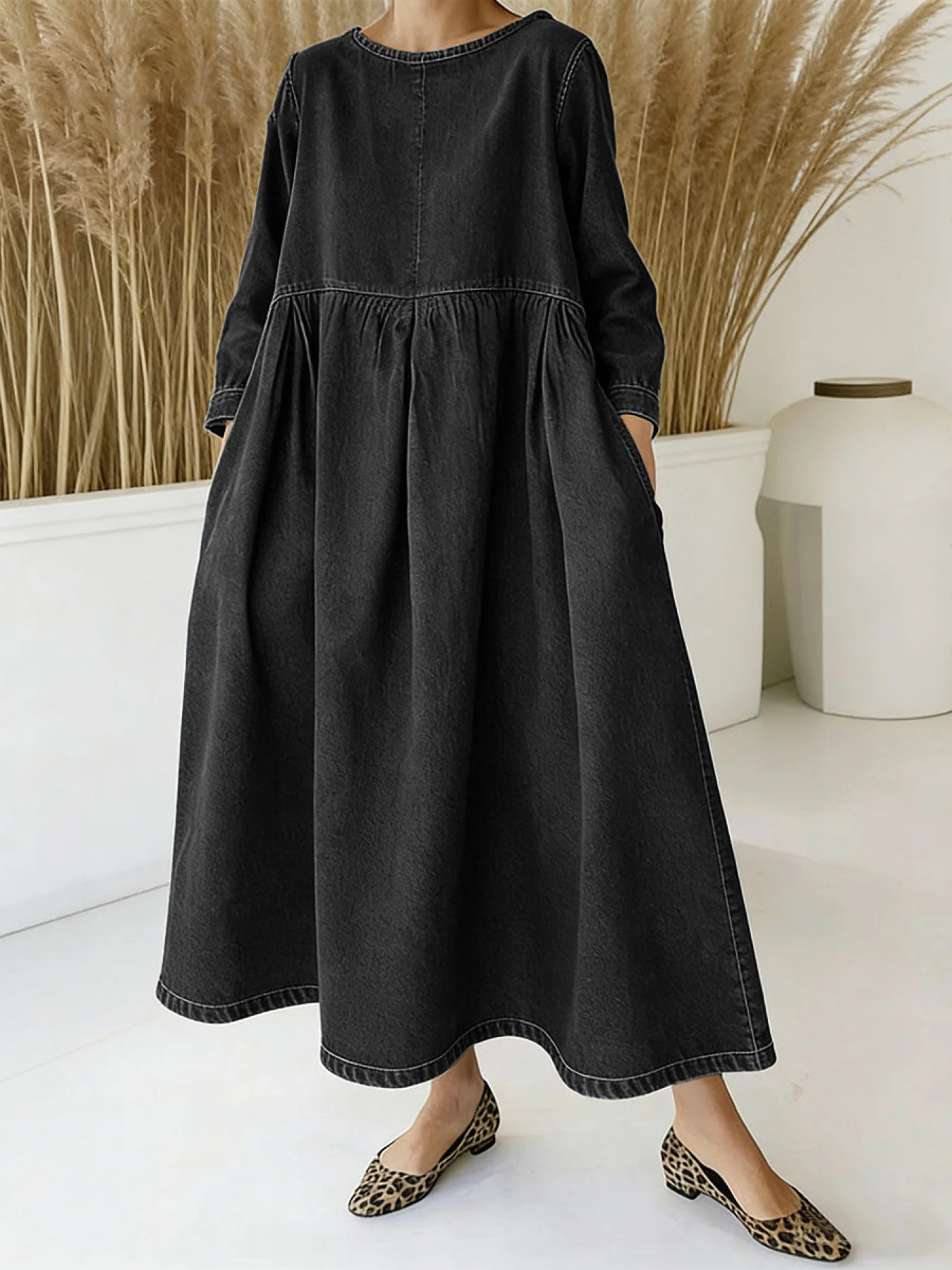 🔥Women's Round Neck Long-sleeved Casual Loose Denim Dress🔥