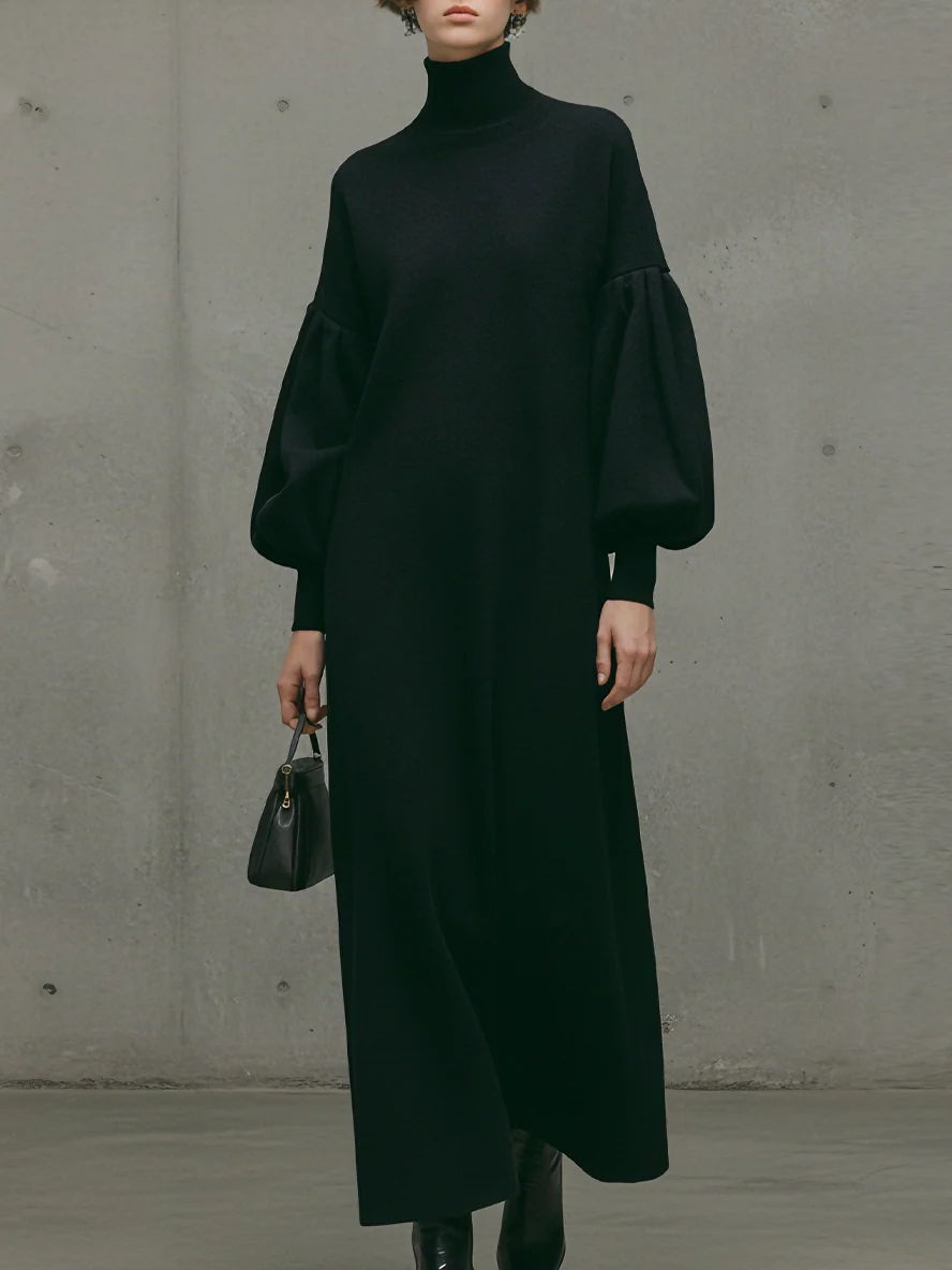 Black Turtleneck Puff Sleeve Maxi Dress