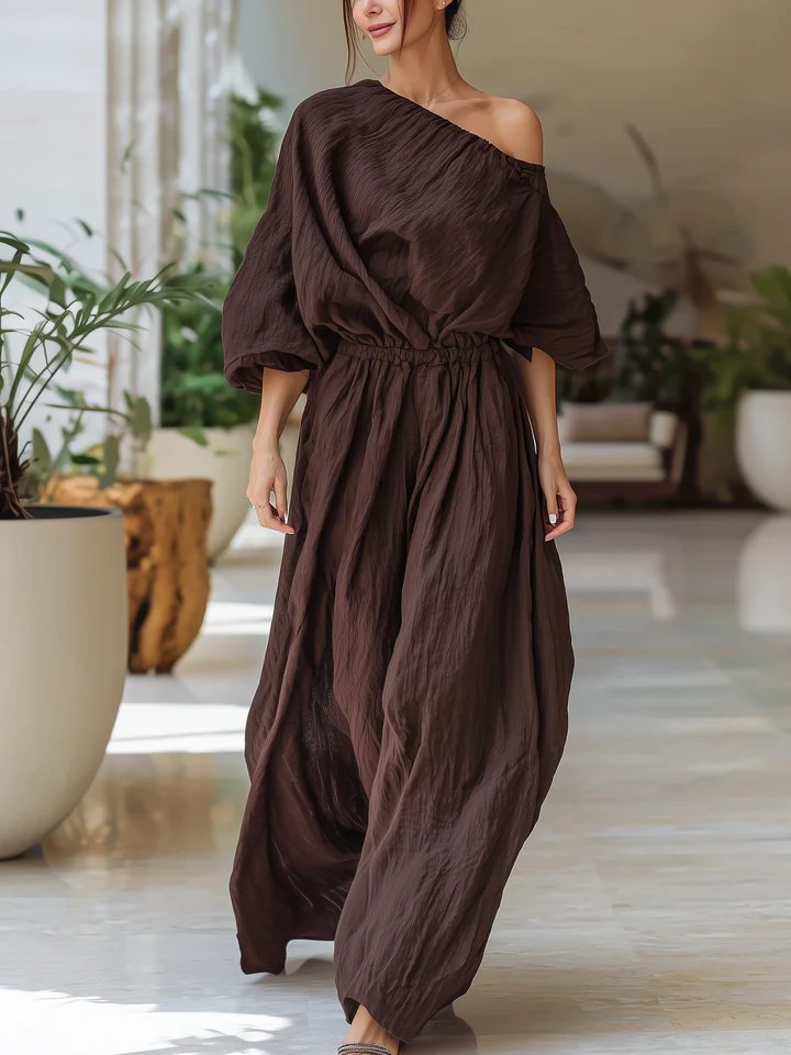Chocolate Brown Ruched One-Shoulder Wide-Leg Jumpsuit