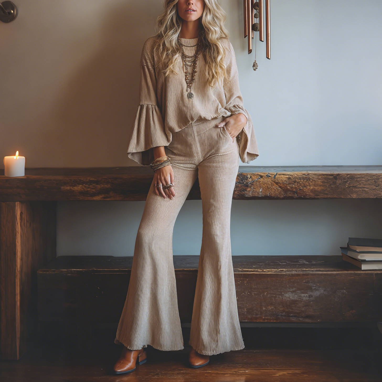 Elegant Lightweight Corduroy Flared Long-sleeved Top And Flared Trousers Set