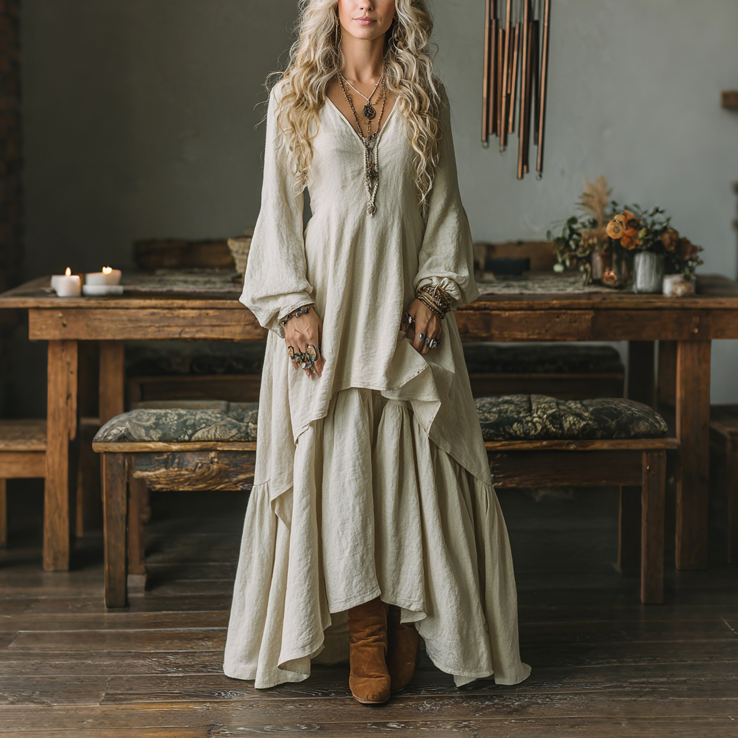 Elegant V-neck High-waisted Linen Long-sleeved Oversized Comfortable And Breathable Dress