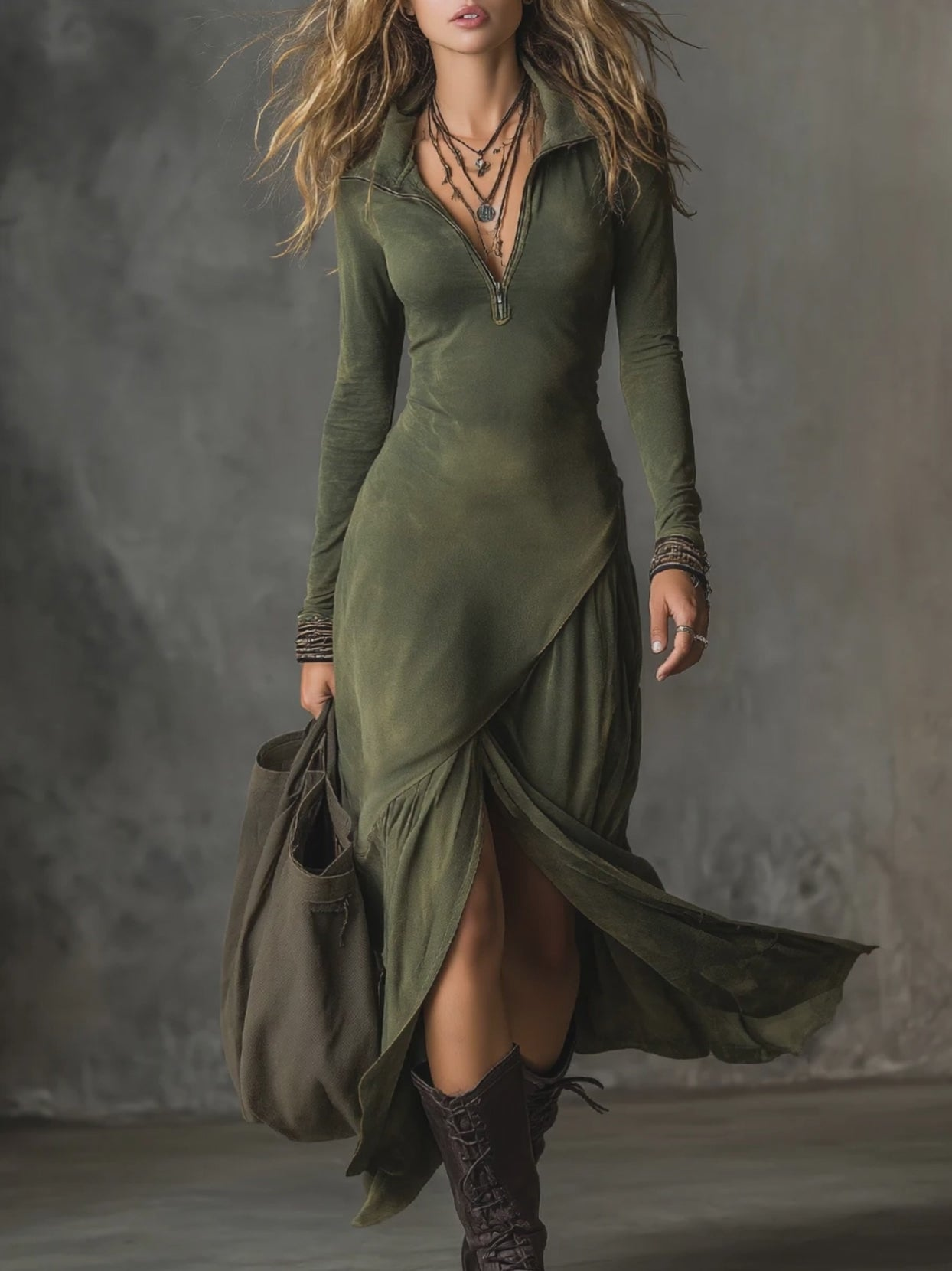 Green Half-zip Collared Pleated Slit Midi Dress