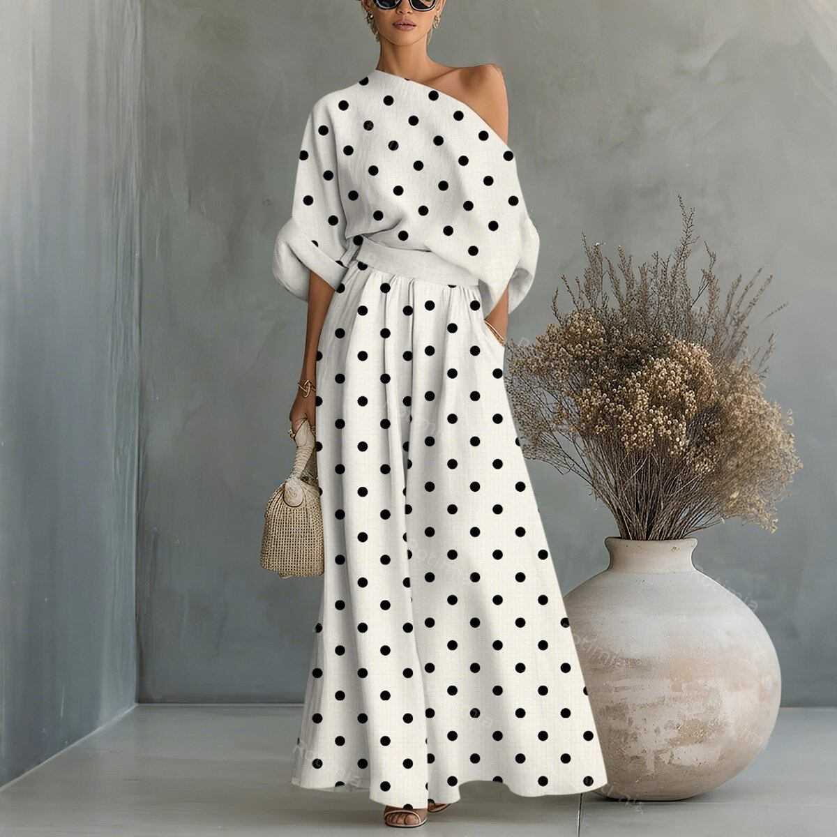 This is a two-piece set consisting of an off-the-shoulder top and a wide-leg trousers. The top features a one-shoulder cut, batwing sleeves, and a wide waist belt. The trousers has a loose, flowing silhouette and a white background with a retro polka dot pattern. The details are simple yet exude a vintage vibe.