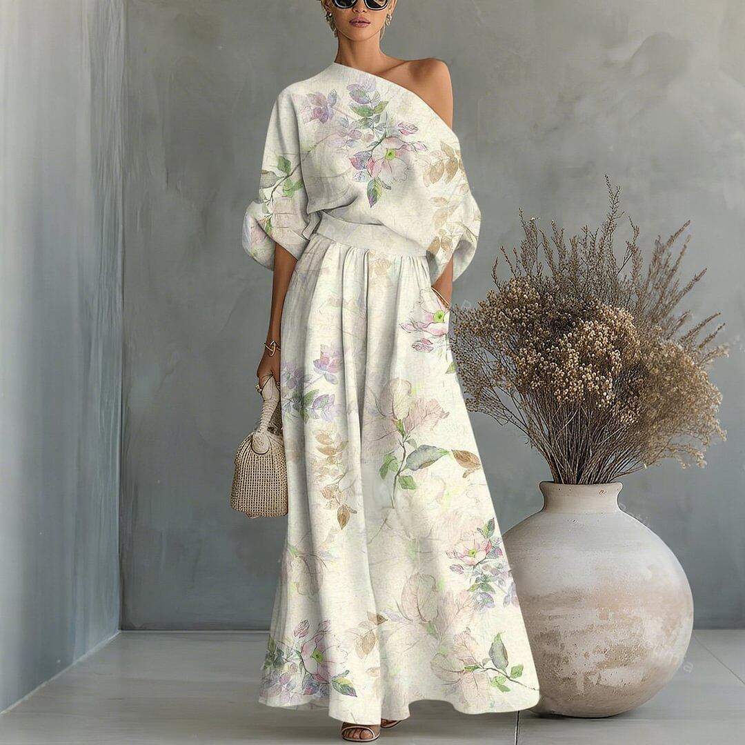 This is a two-piece set consisting of an off-the-shoulder top and a wide-leg trousers. The top features a one-shoulder cut, batwing sleeves, and a wide waist belt. The trousers has a loose, flowing silhouette, with a soft floral and leaf pattern on a creamy white background, creating a delicate and romantic look.