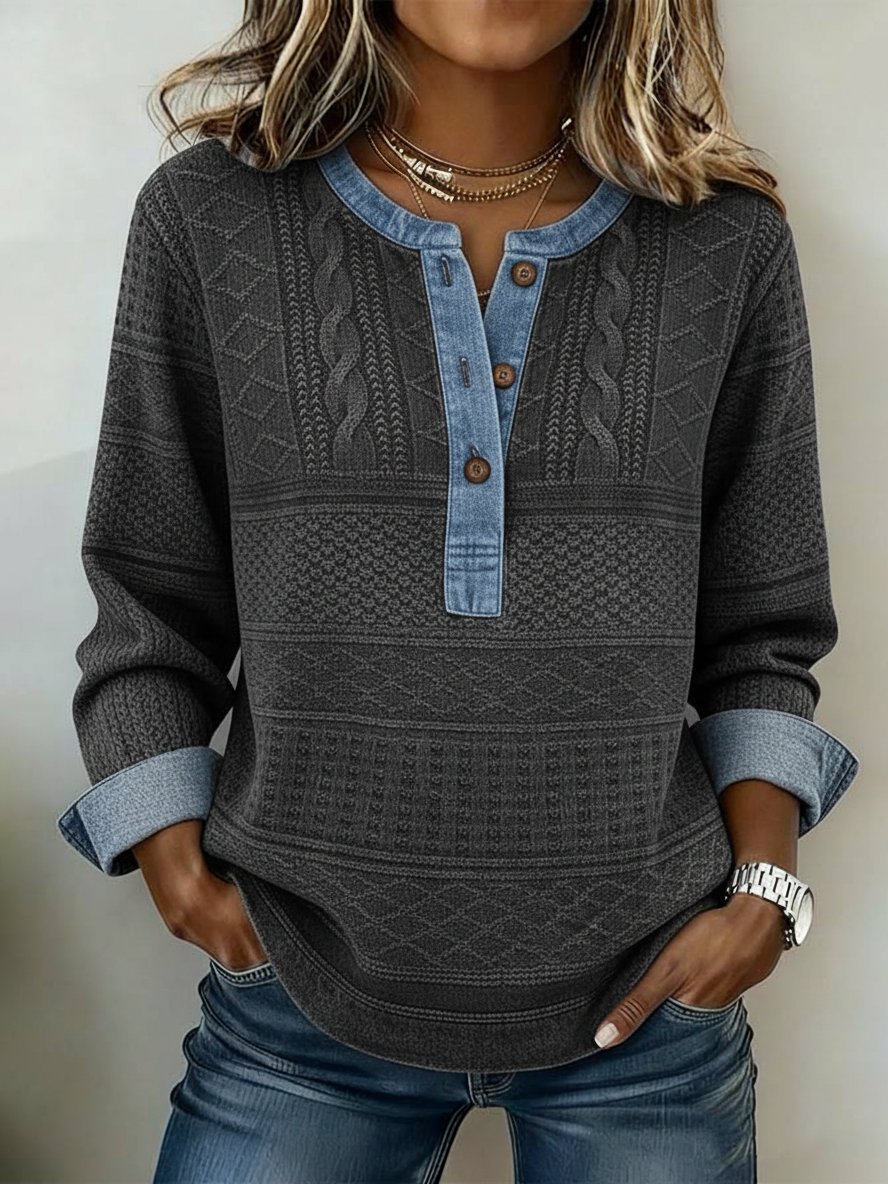 Women's Casual Sweater Print-patched Denim Pullover Sweatshirt