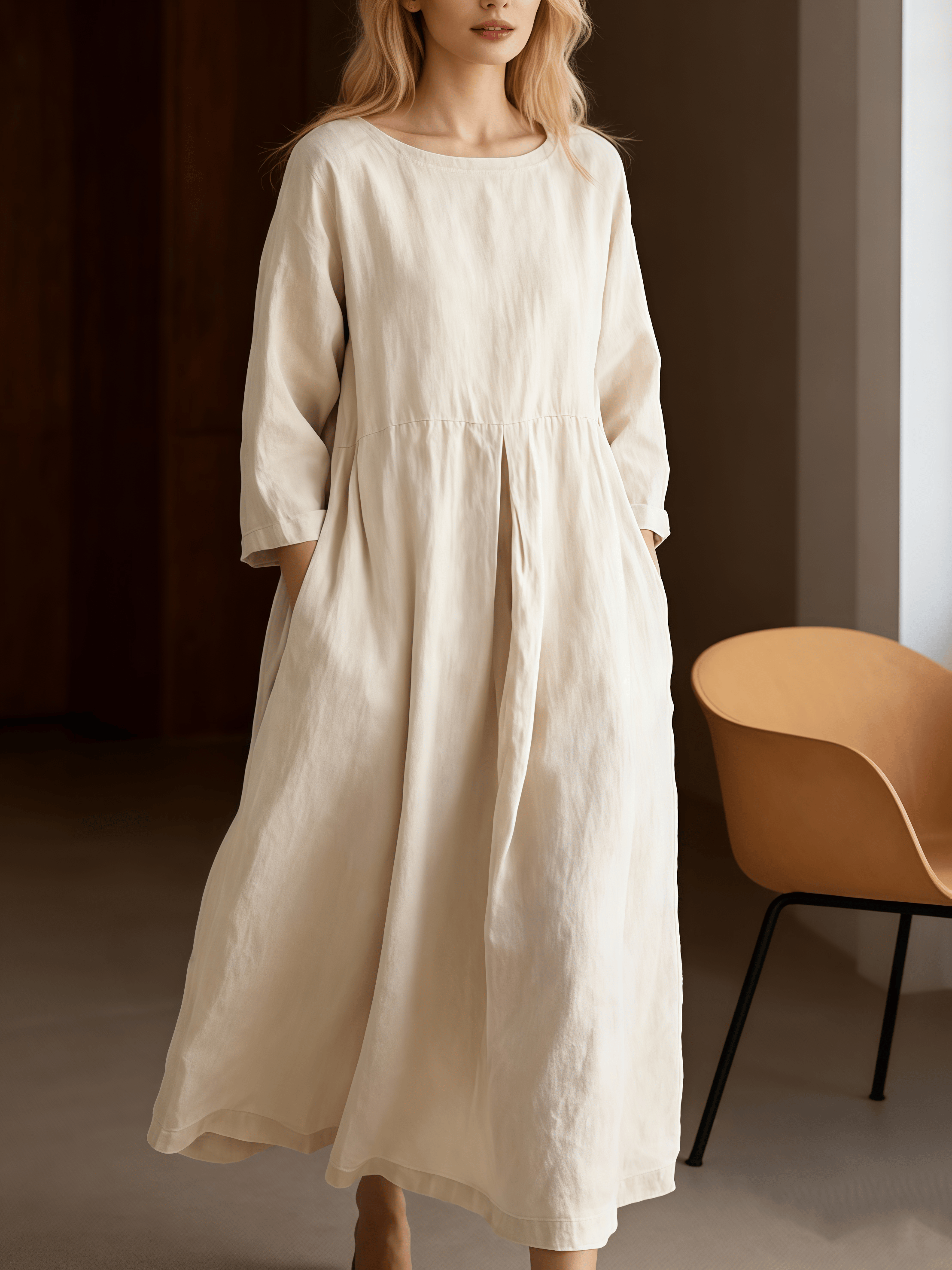Women's Round-Neck, Pleated, Loose-Fitting Cotton And Linen Dress